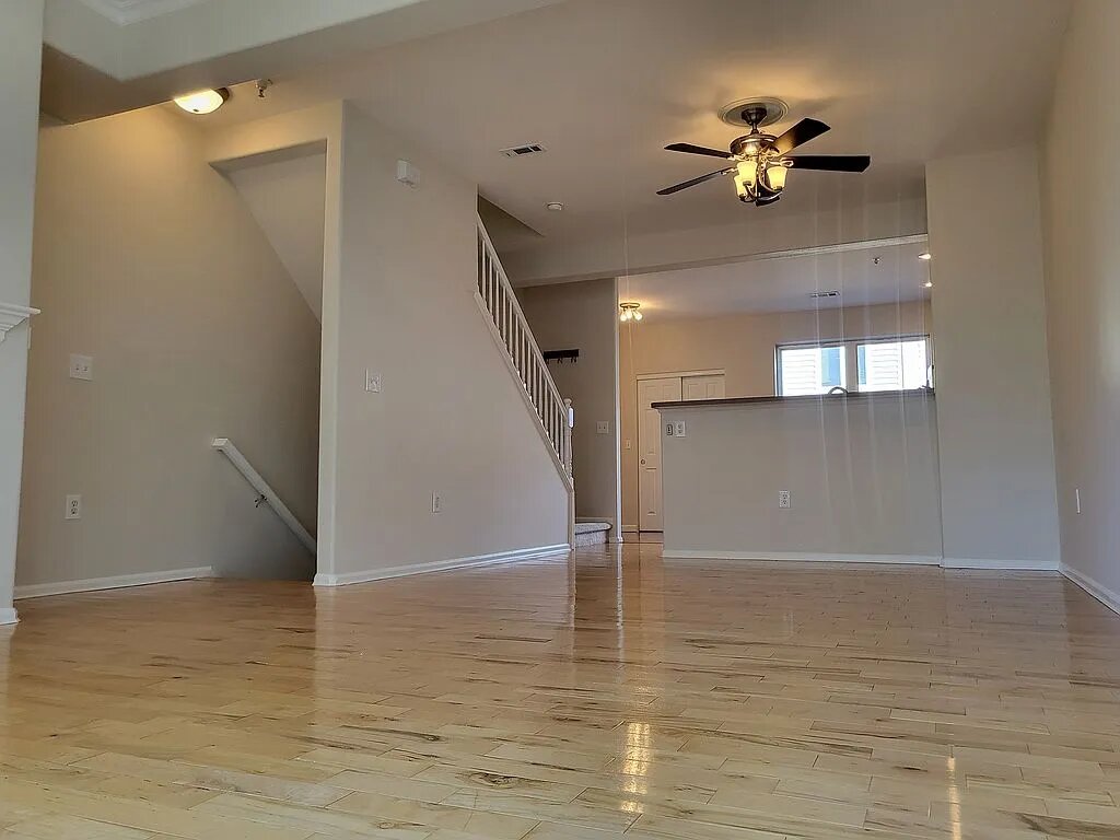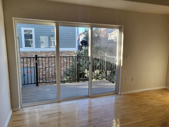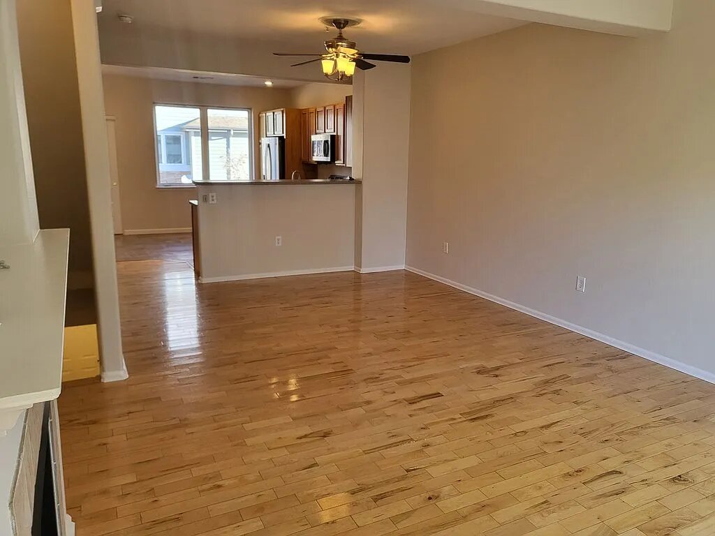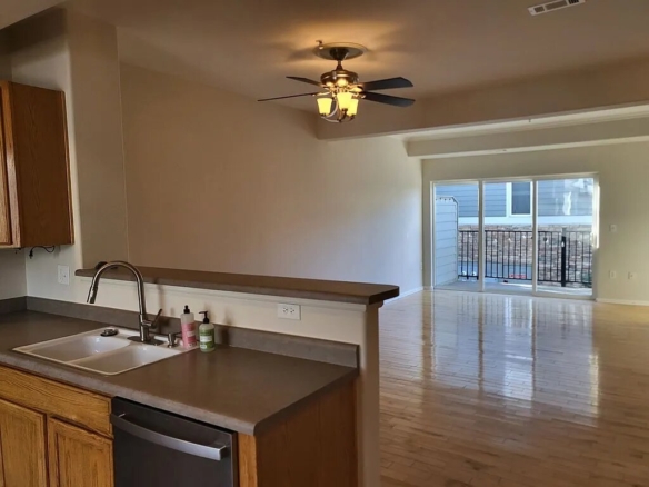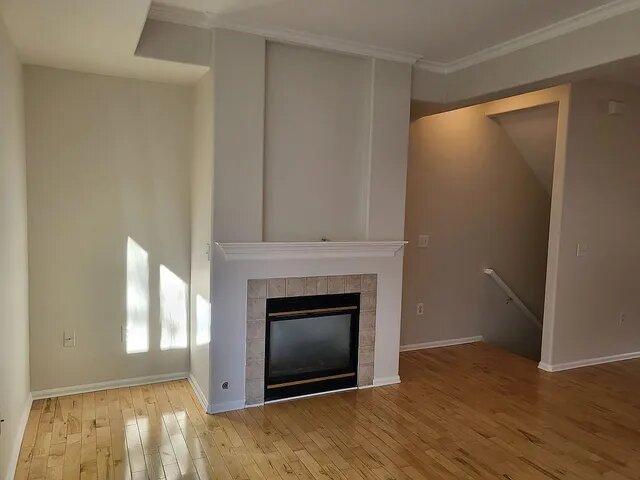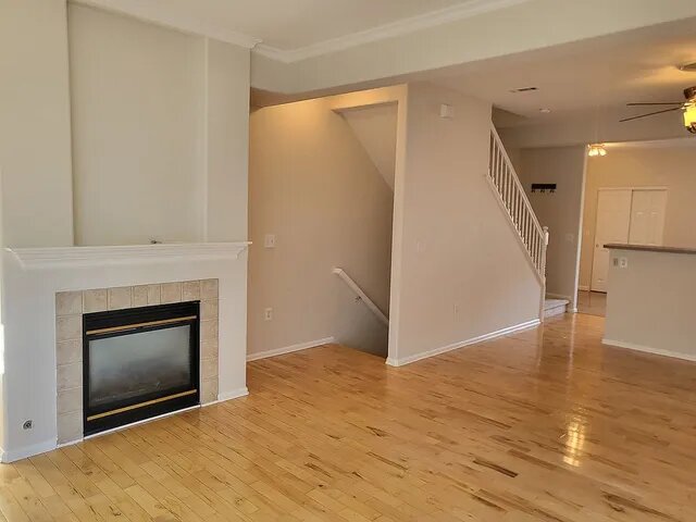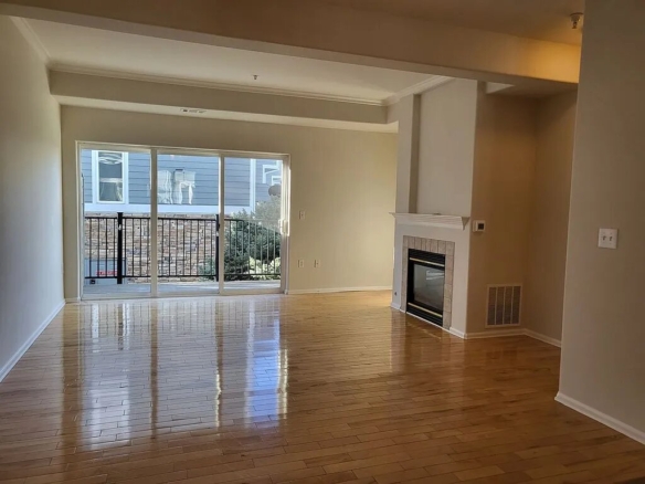 The main living area features hardwood floors and a cozy gas fireplace, creating a warm and welcoming space to relax or entertain. Large windows on both sides of the unit fill the home with fantastic natural light, while a private balcony overlooking a tranquil green space provides the perfect spot for morning coffee or evening unwinding.