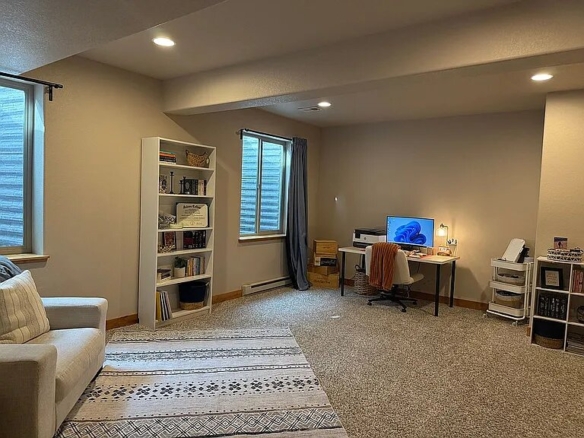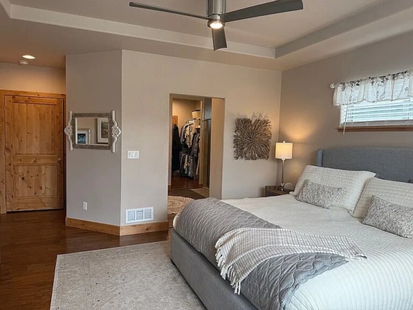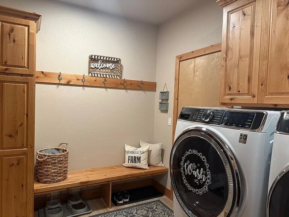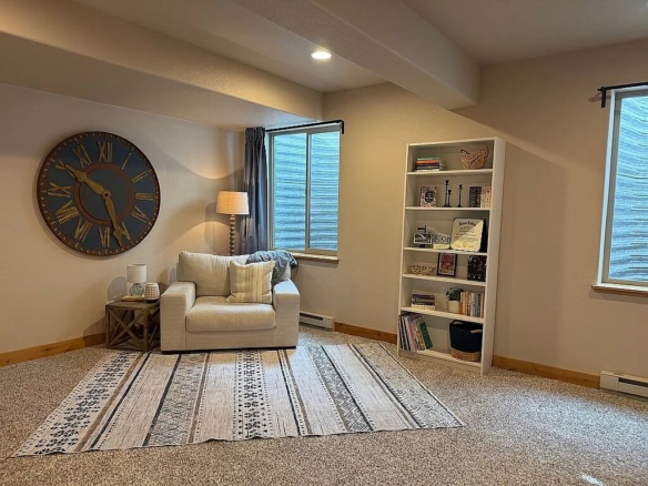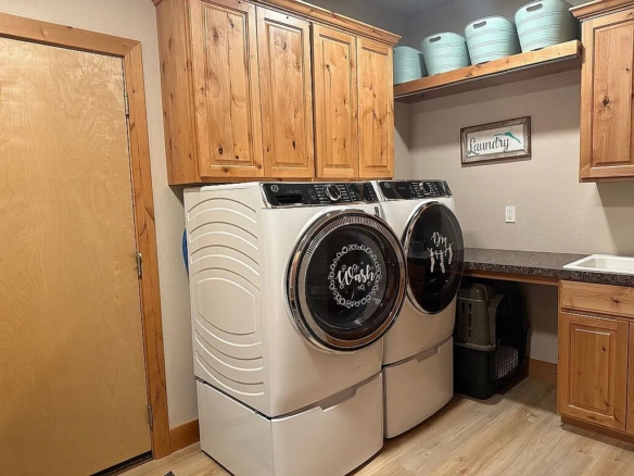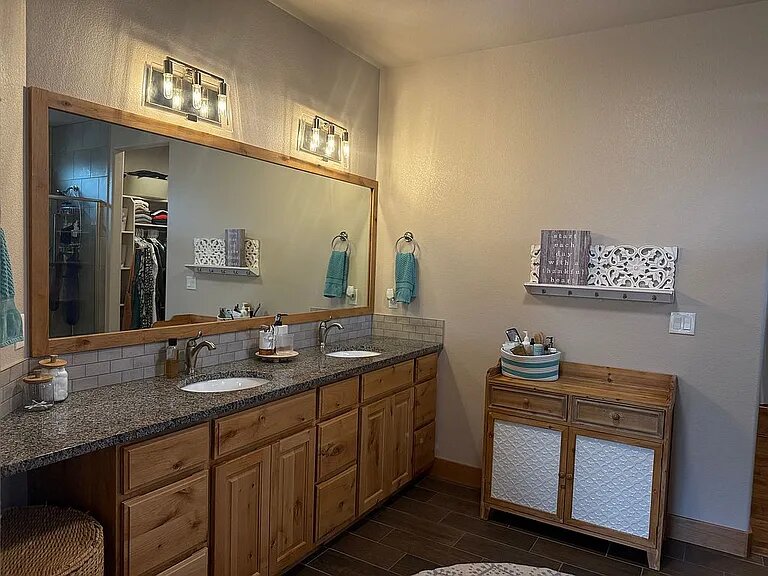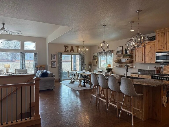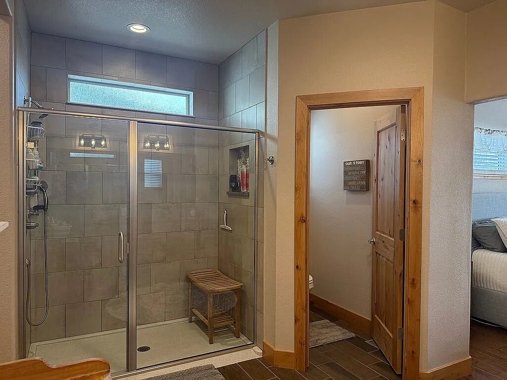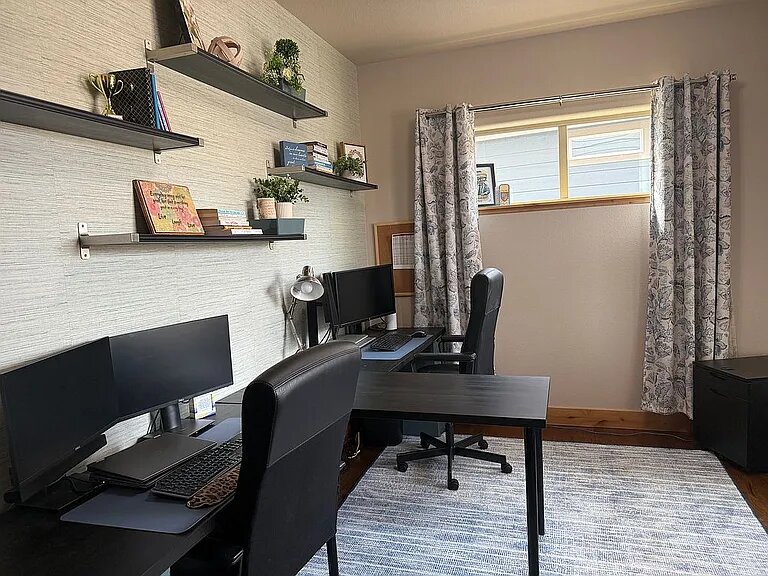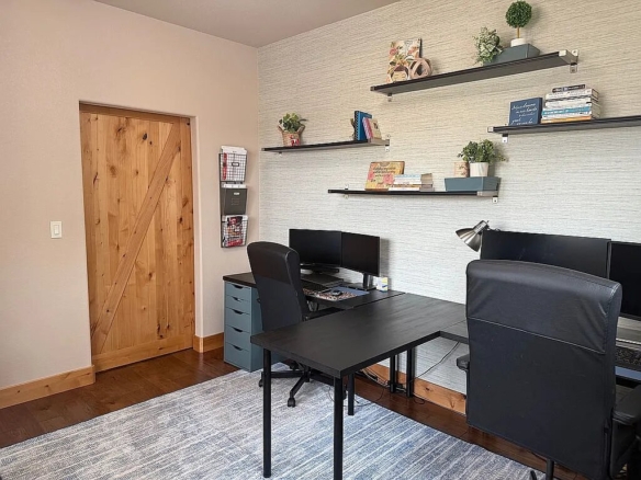 The main level offers true single-level living with high ceilings, an open-concept layout, two spacious bedrooms, and a dedicated office. The kitchen is both stylish and functional, featuring stainless steel Fisher & Paykel appliances, a gas range, a large island, and quality cabinetry. It flows seamlessly into the dining and great room, centered around a cozy fireplace. Hardwood floors and rich wood trim add warmth and character throughout.