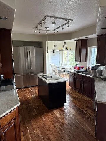 This 4-bedroom, 4-bath home features a desirable main-floor primary suite and an open, light-filled layout with vaulted ceilings, new hardwood floors, and updated carpeting. The gourmet kitchen is equipped with cherry wood cabinetry, custom granite countertops, and stainless steel appliances, flowing seamlessly into the living and dining areas.