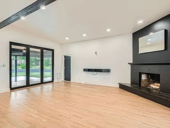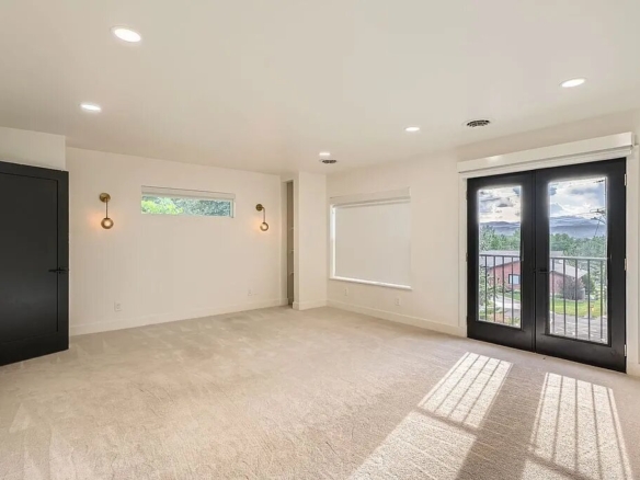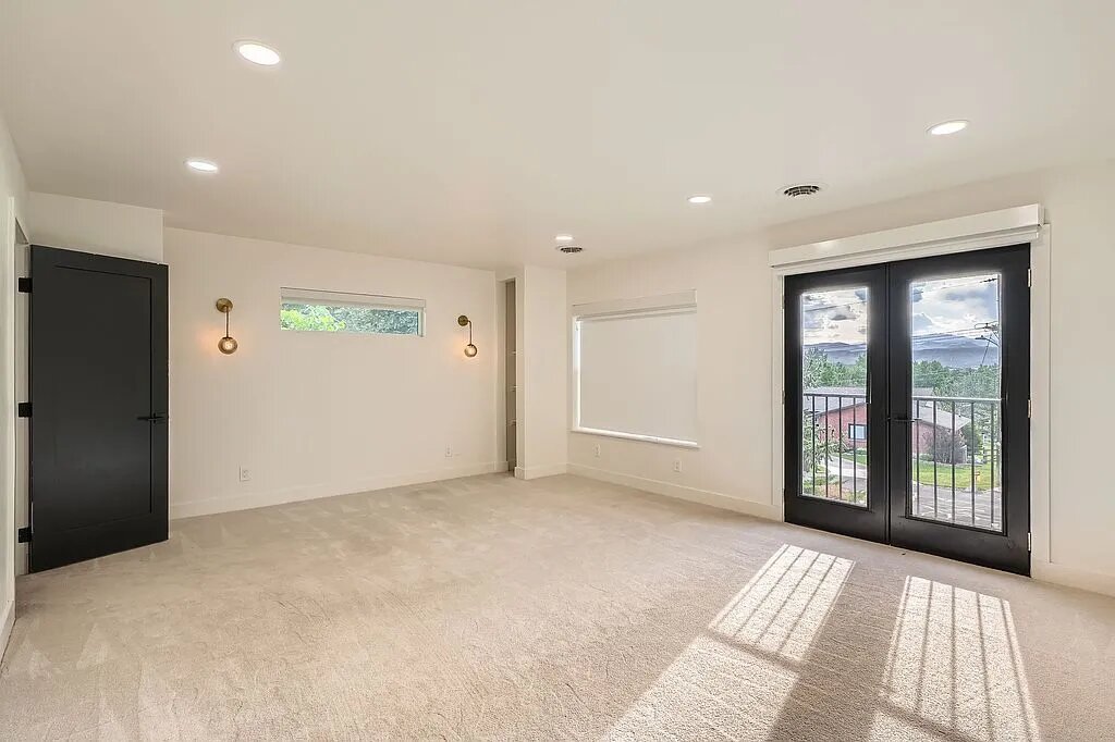 The main level showcases a stunning open-concept design anchored by a chef’s kitchen featuring striking waterfall quartz countertops, an oversized island with mountain views, and premium finishes throughout. The living space is equally impressive, highlighted by a wood-burning fireplace, expansive windows, and a dramatic accordion glass door that opens to an oversized backyard—creating effortless indoor-outdoor living.